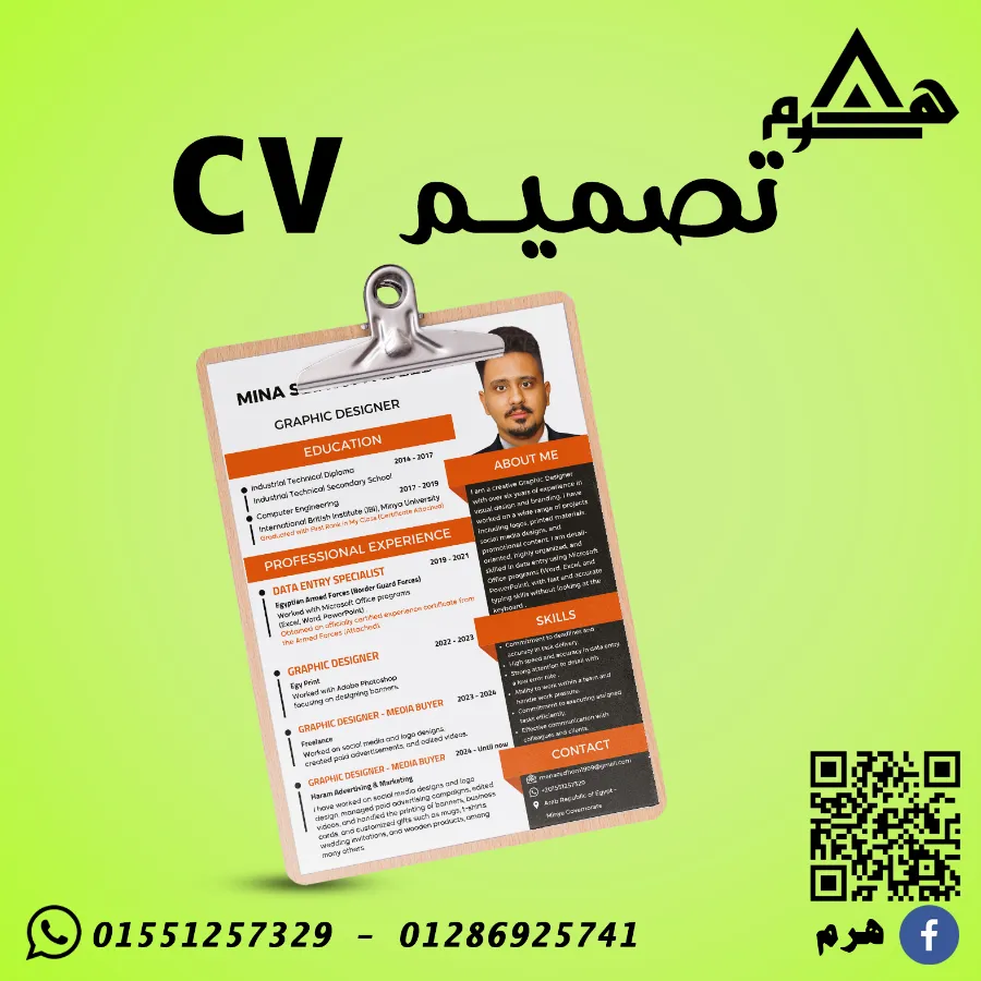 بنصمم لحضرتك CV احترافي بشكل جذاب ومرتب يناسب سوق العمل ويظهر خبراتك بشكل قوي.
